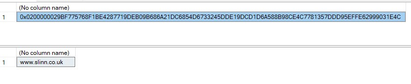 So this example works fine as we’re using the @encrypt variable but if you put data into a table using a VARBINARY column after the decrypt you also need to convert it back to an NVARCHAR see the example below